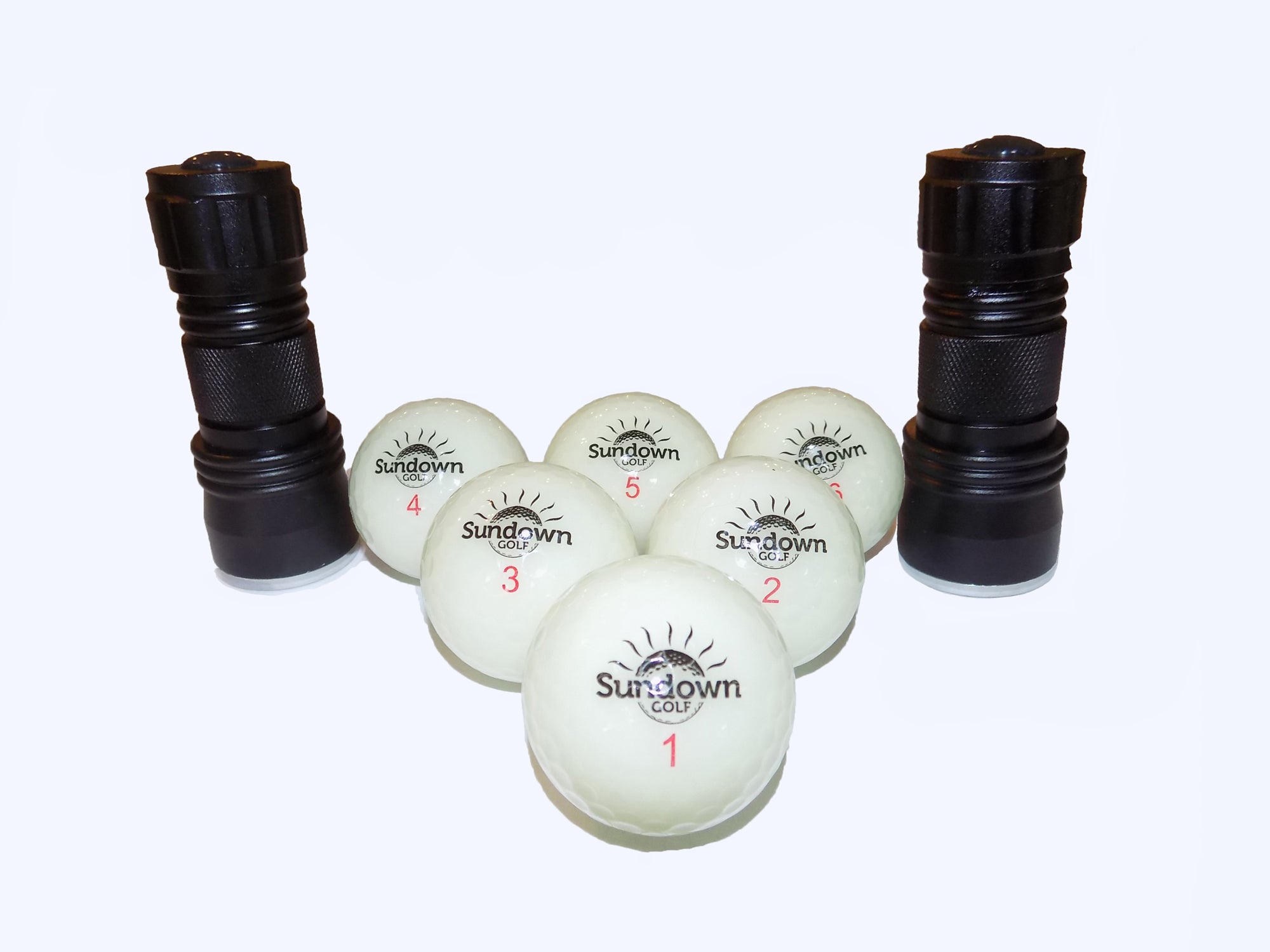 Each package includes 1 x 6-pack of vivid glow-in-the-dark golf balls, and 2 UV flashlights with which to charge them.