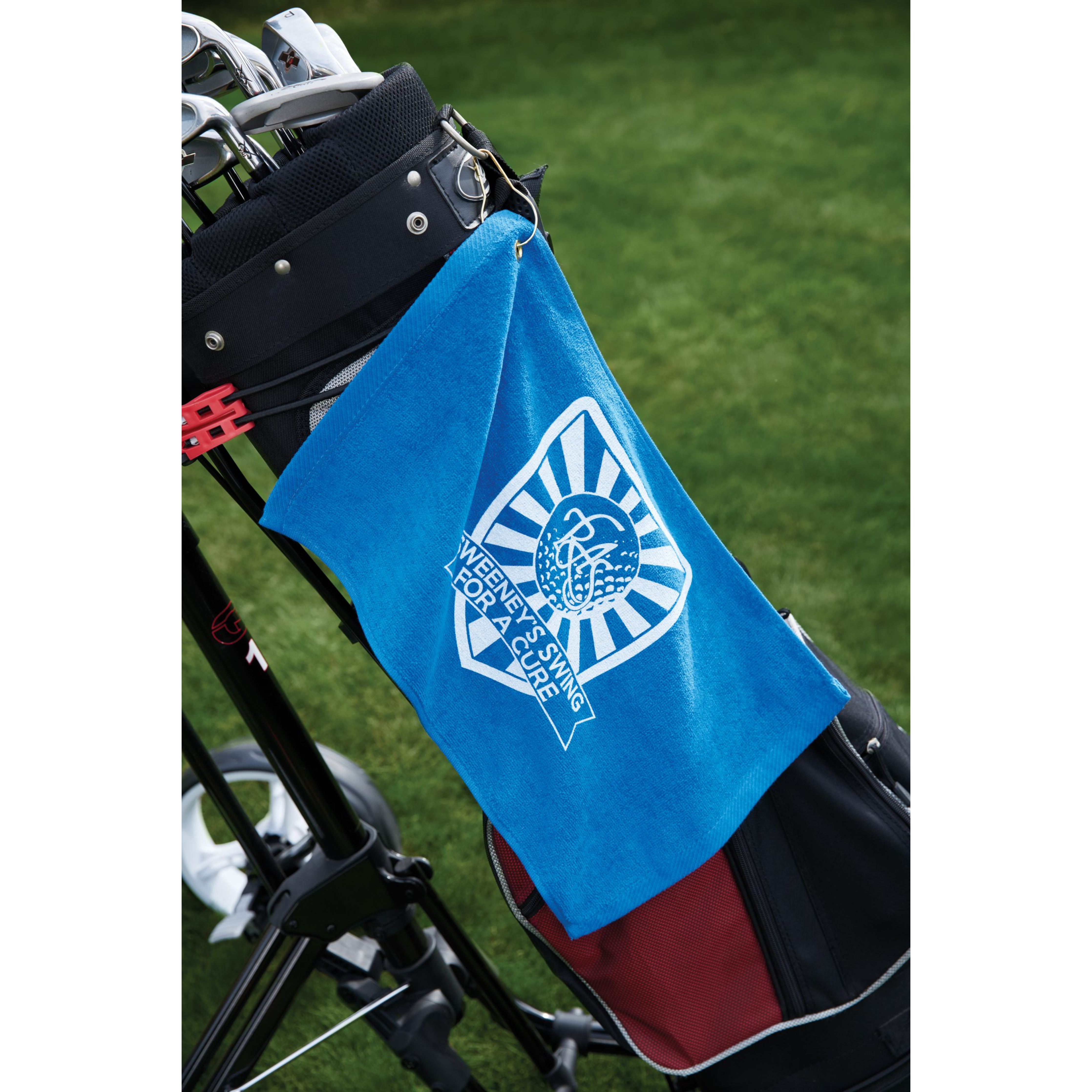 Practice your swing while showing off your logo with this absorbent, 100% cotton terry velour fingertip towel. Included grommet and hook make it easy to hang on your golf bag. Promote your next golf outing on a reasonable budget.